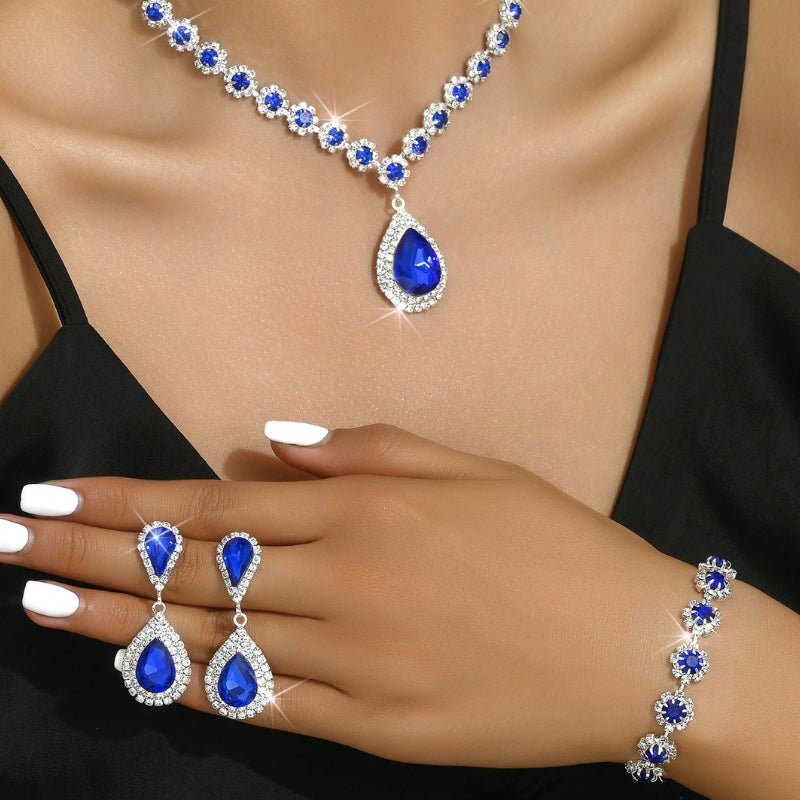 The Royal Gems Set is meticulously crafted with vibrant, teardrop gemstones encircled by shimmering accents. Designed to captivate, this set includes a stunning necklace, a pair of graceful earrings, and a matching bracelet that together provide a timeless collection for any special occasion.